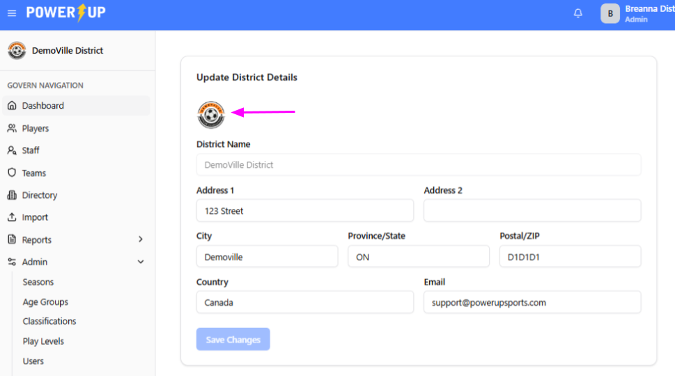 Your District name will already be visible in the Ontario Soccer Govern module when you log in, but you'll need to update the address and your District logo.
