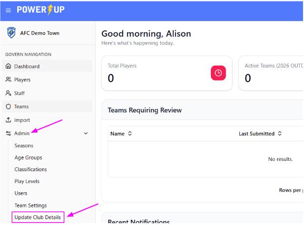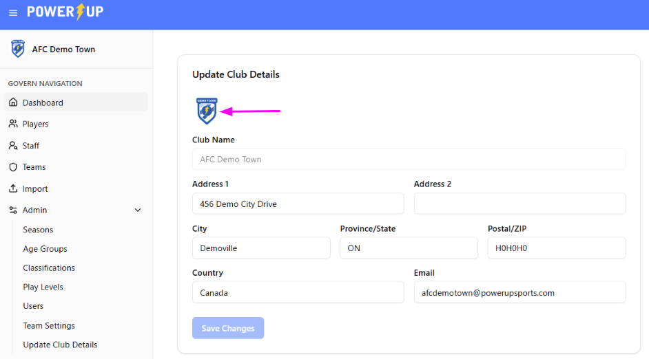 Your District Administrator will have entered some club information when they set up your club's instance on the Ontario Soccer Govern module. However, we recommend that you have a look to confirm the entered information is correct, and also take this opportunity to upload your club's logo.