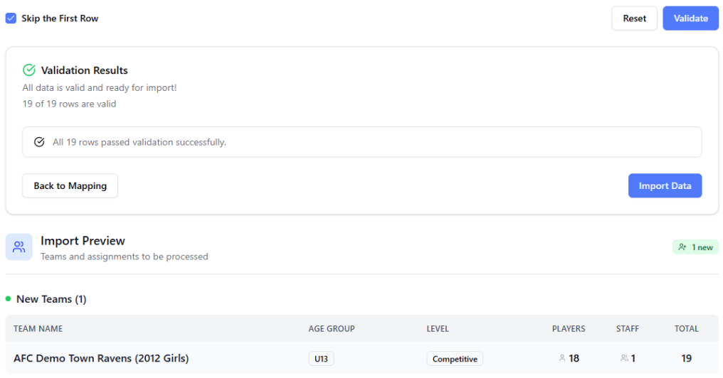 This will summarize the actions to be taken upon completing the import - specifically, any teams to be created (or updated if the team has already been created) and the number of players and/or team staff for each.