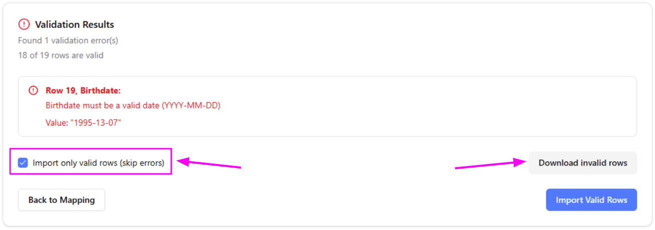 Example of validation results with an error, and the option to download the invalid rows. - Import Preview