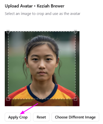 5. You’ll be presented with a tool to crop the photo. Click and drag the corners to resize the cropped area, and click and drag the square to choose your crop area. Make sure it complies with Ontario Soccer’s requirements (head and shoulders, facing forward, no hats, etc.). When ready, click Apply Crop.