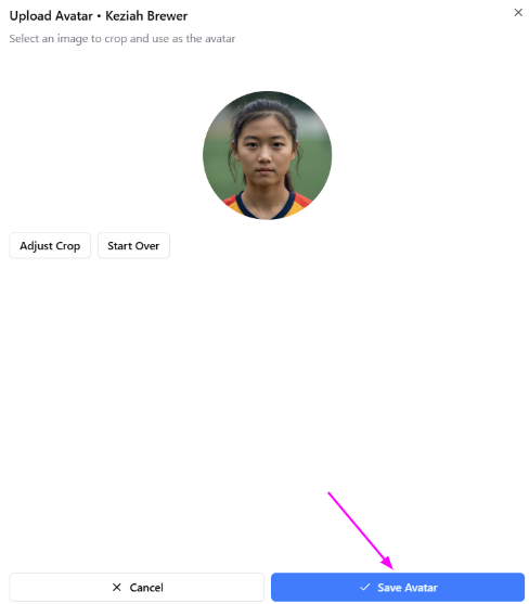 The photo will be saved to the player or staff member’s profile and will now be visible on the Team Roster page.