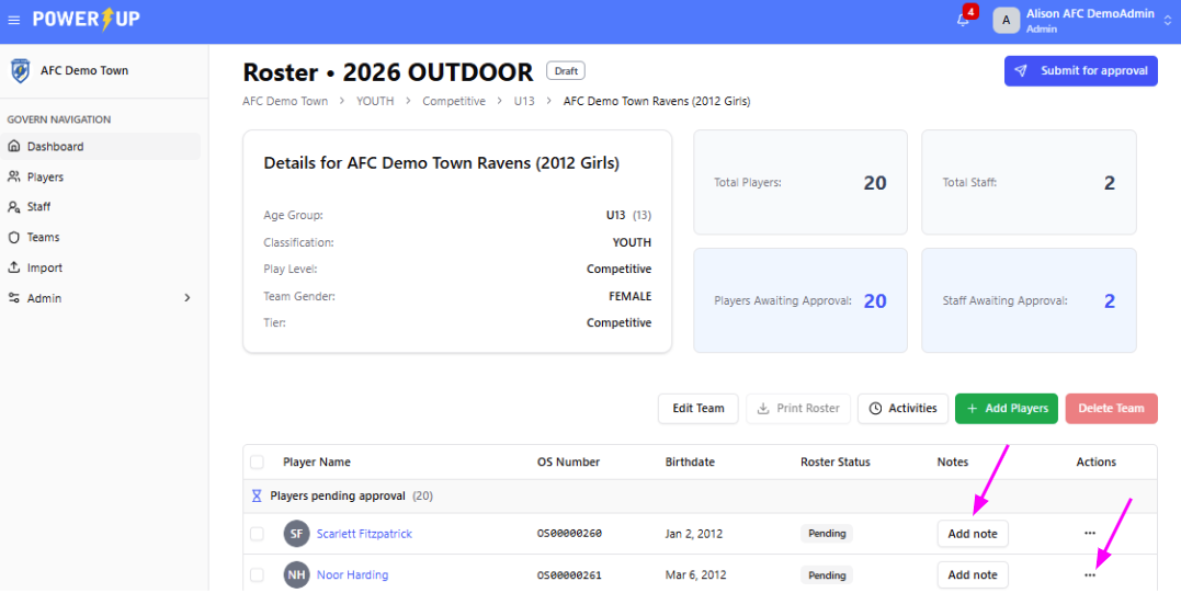 - If you wish (or need) to include any notes for players or team staff for the District Administrator, you may do so by clicking the Add Note button next to the relevant player or team staff member.