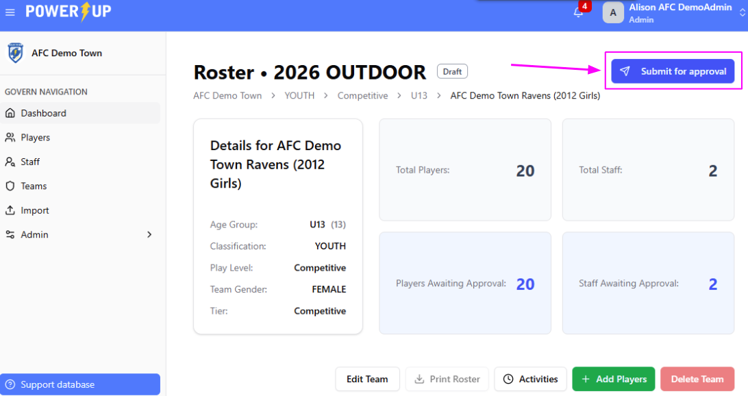 You've imported or synced your players and team staff and added them to team rosters. Great! The next step for team rosters requiring district approval is to submit your teams to your District Association.