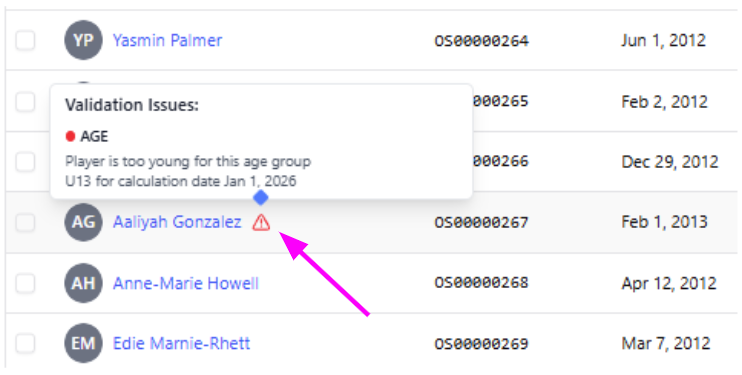 Example of a warning icon. In this example, the player’s DOB (2013) is too young for this age group.