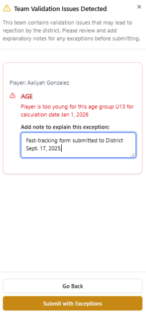 When you click the Submit for Approval button for a team with players that have warnings, you'll be prompted to provide an exception note(s) that will be visible to the District Administrator when approving your team.