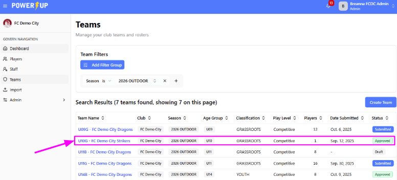 When the District approves a Team Roster, you'll receive a notification in the Ontario Soccer Govern module. Once approved, you'll be able to access the Print Team Roster tool, allowing you to access a pdf of the official approved Team Roster.