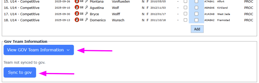 That section will expand, revealing another button (Sync to GOV). Click it to begin the process of syncing this specific team to the Ontario Soccer Govern module.
