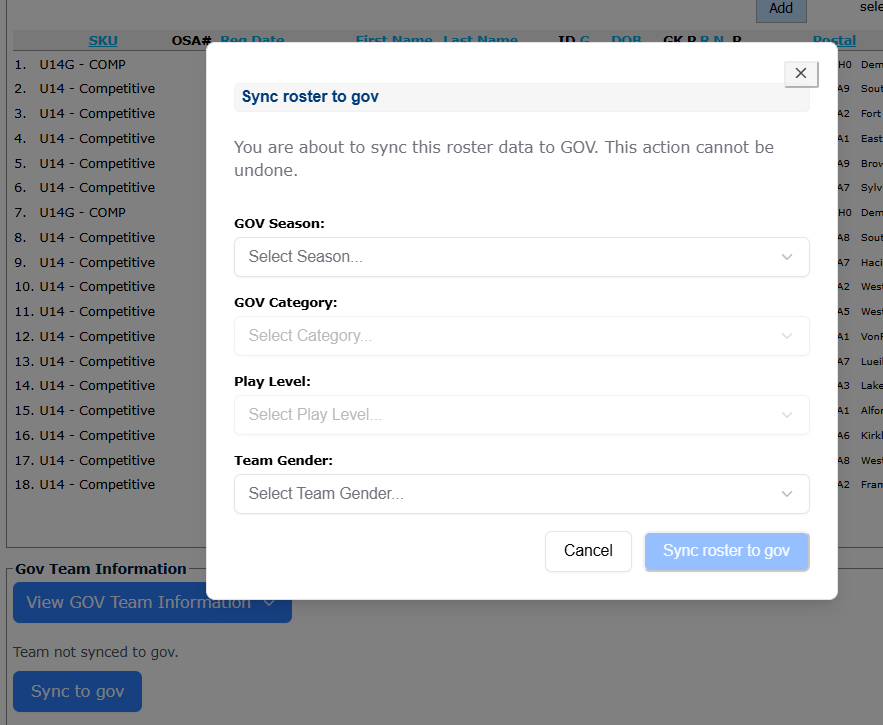 You can sync an individual team to the Ontario Soccer Govern module where needed.
