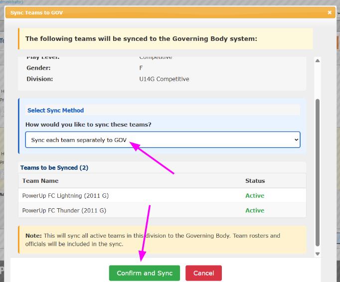 - You’ll be presented with a summary of the teams to be synced to the Ontario Soccer Govern module. When ready, click the Confirm and Sync button
