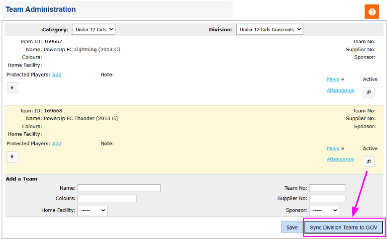 You can sync all teams in a division in bulk to the Ontario Soccer Govern module where needed.