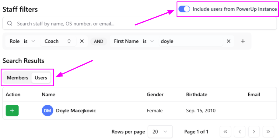 That only leaves the team staff (coaches, managers, etc.) being added to the team. If the club isn’t using Convenor, the usual method (syncing the team) of adding the team staff is unavailable. Instead, the club can use the new 'Include users from PowerUp instance' tool available on the 'Add Team Staff' search slideout to directly add an existing user from the club’s PowerUp instance. Instructions for doing so are below.