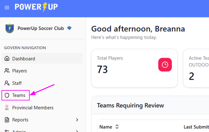 While logged in as an administrator in the Ontario Soccer Govern module, click the Teams option in the Govern Navigation menu on the left