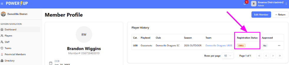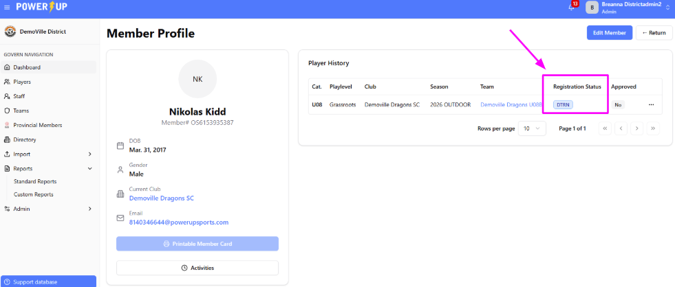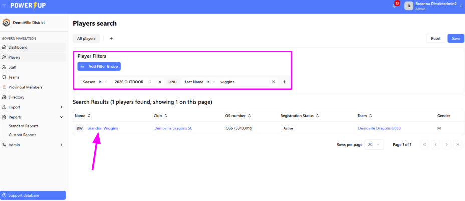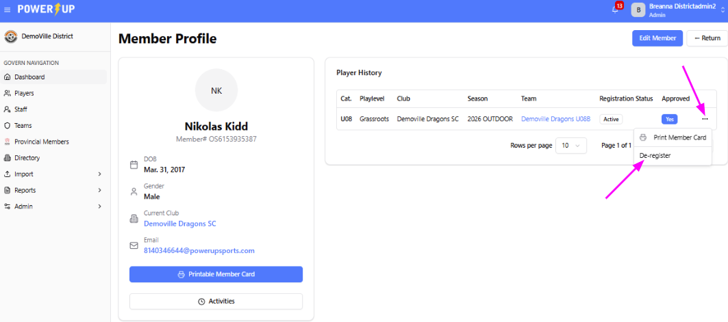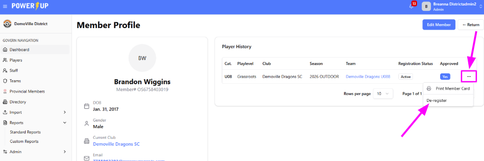 - Use the filters to search for the specific player you need to de-register. Click their name to access their Member Profile.
