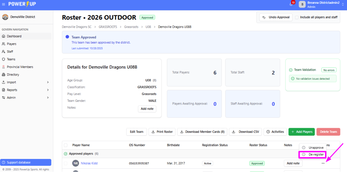 - Click the three dots on the right side of the registration assignment you wish to de-register the player from. Click the De-Register option in the menu that appears.