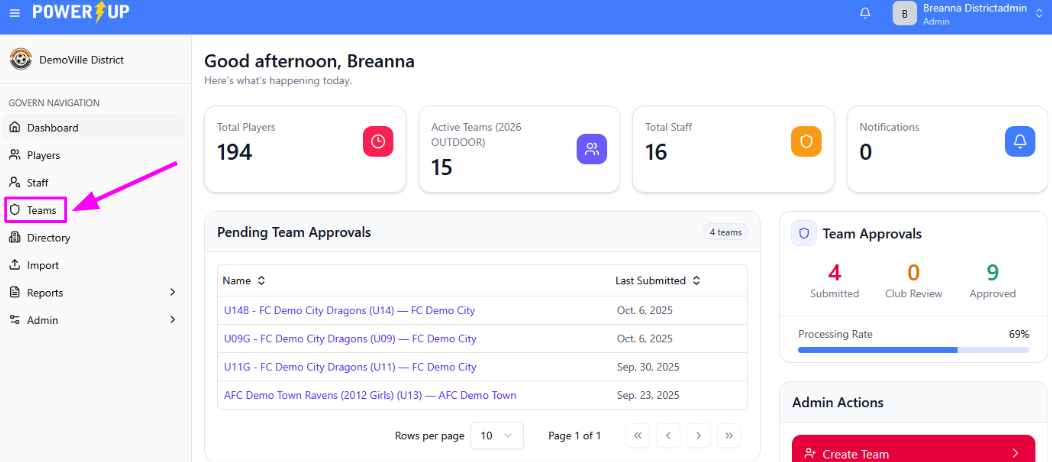 - Navigating to the Teams option (indicated in the screenshot below) in the Govern Navigation menu on the left of the page, then clicking the team name.