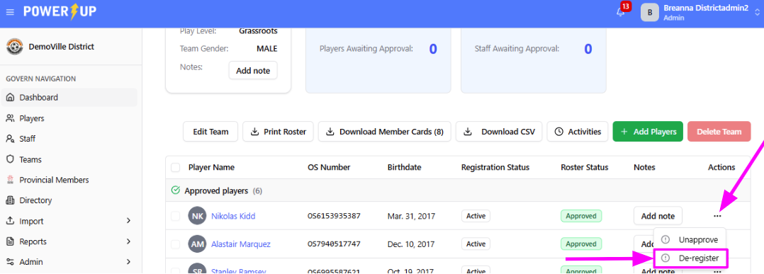 - For the player you wish to de-register, click the three dots in the Actions column on the right side of the page and select the De-Register option.