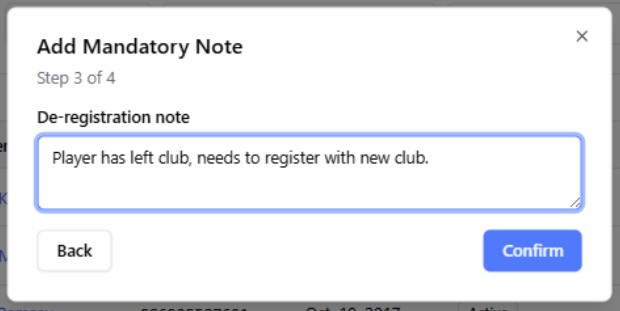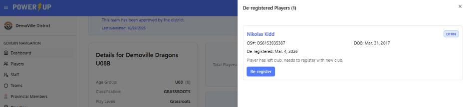 - The player is de-registered, and removed from the Roster. A De-Registered Players button becomes available, which when clicked results in a slideout appearing from the right, showing any de-registered players associated with that team.