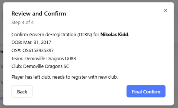 - Confirm the De-Registration details and click Final Confirm when ready.