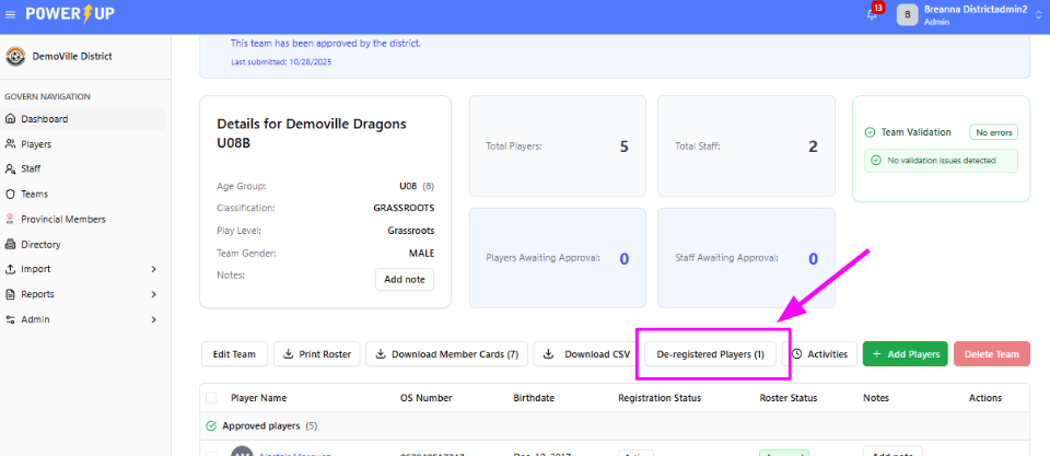 View of the De-Registered button that appears after a player(s) has been de-registered from a team roster.