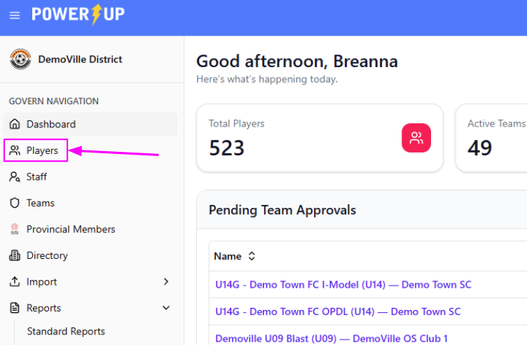 - Navigate to the Players page using the Players option in the Govern Navigation menu on the left.