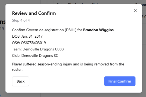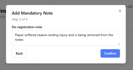 E.g.: Player suffers a season-ending injury and needs to be removed from the approved roster, but was a part of the team/registered prior to de-registration. - DTRN