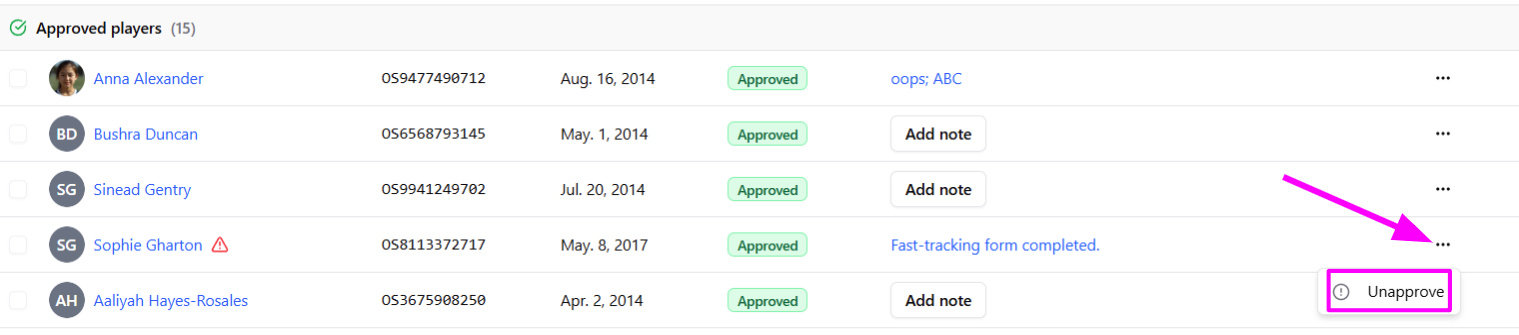 Once the status has been changed from Approved to Rejected, the Club will be able to reset the status to Pending. While a player is pending, they can be removed from the team using the checkbox to the left of their player photo.